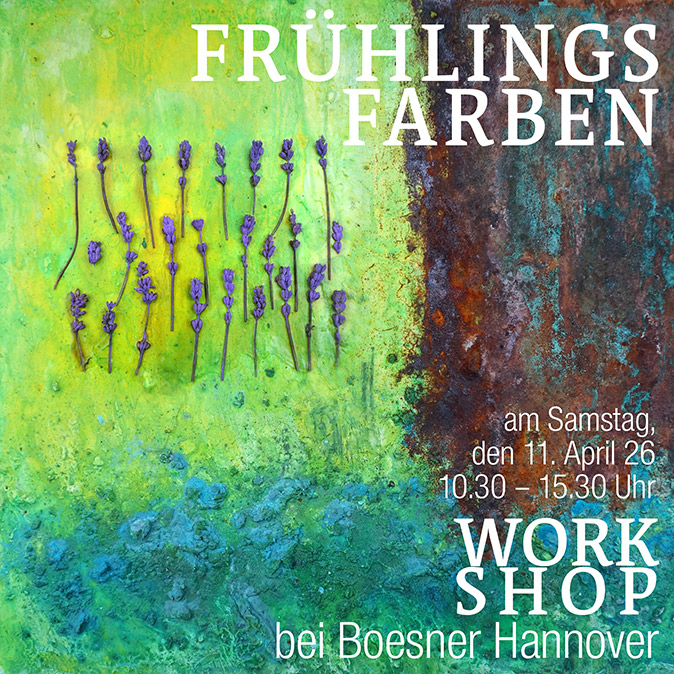 Knospen, Blüten, Sonnenlicht – die Natur inspiriert zu dieser Jahreszeit mit kräftigen Farben. Abstrakte Landschaften bilden sich aus unterschiedlichen Objekten, Materialien und Schattierungen. Das ist der Inhalt unseres Kurses.  Gearbeitet wird auf Leinwand, Holz oder Karton. Gepresste Pflanzen und gefundene Objekte werden in die Bilder eingearbeitet. Wir schichten gefundene Objekte aus der Natur mit Spachtelmassen, Pigmenten und Firnissen. Rost entsteht, indem wir Eisen-, Kupfer- und Bronzelösungen hinzufügen. Dadurch erhalten unsere Werke nach einiger Zeit eine interessante Patina. Auch hier haben wir ein breites Gestaltungsspektrum. Wir können realistische Motive zeichnen und malen, Zeitungsausschnitte etc. mit abstrakten Elementen kombinieren und daraus Farb- und Strukturcollagen entstehen lassen. Dieser Kurs ist auch für Anfänger ohne Vorkenntnisse geeignet.
