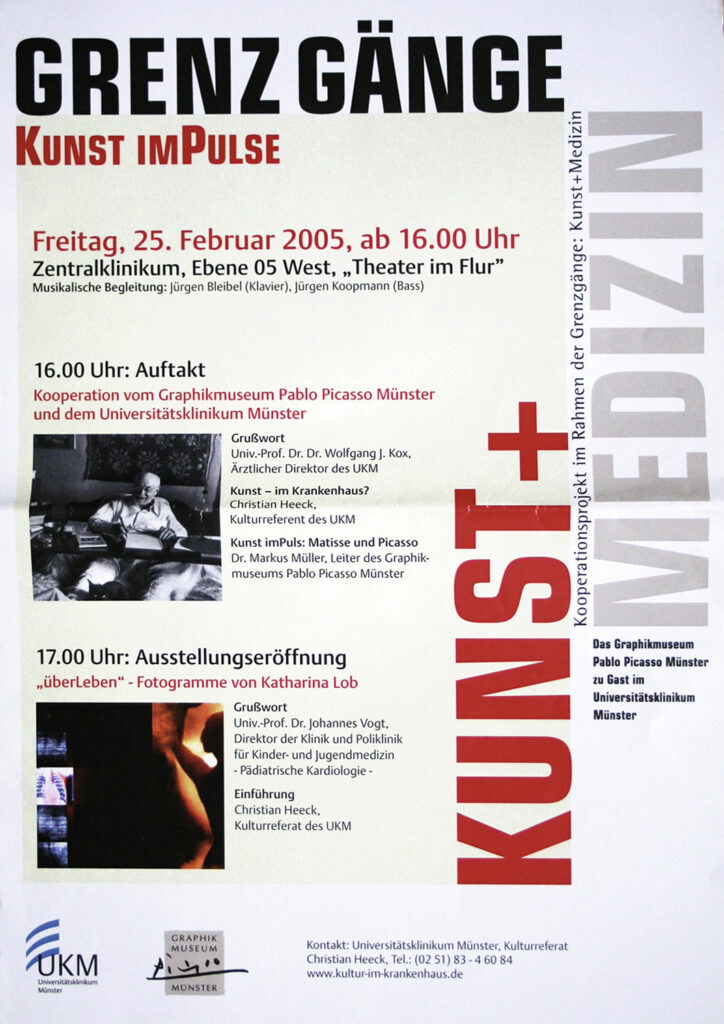 Meine erste große Ausstellung, in der ich Fotogramme mit meinen Röntgenbildern zeigte, war 2005 in Münster in der Uniklinik, in der ich Jahrzehnte vorher als Kind am Herzen operiert worden war.